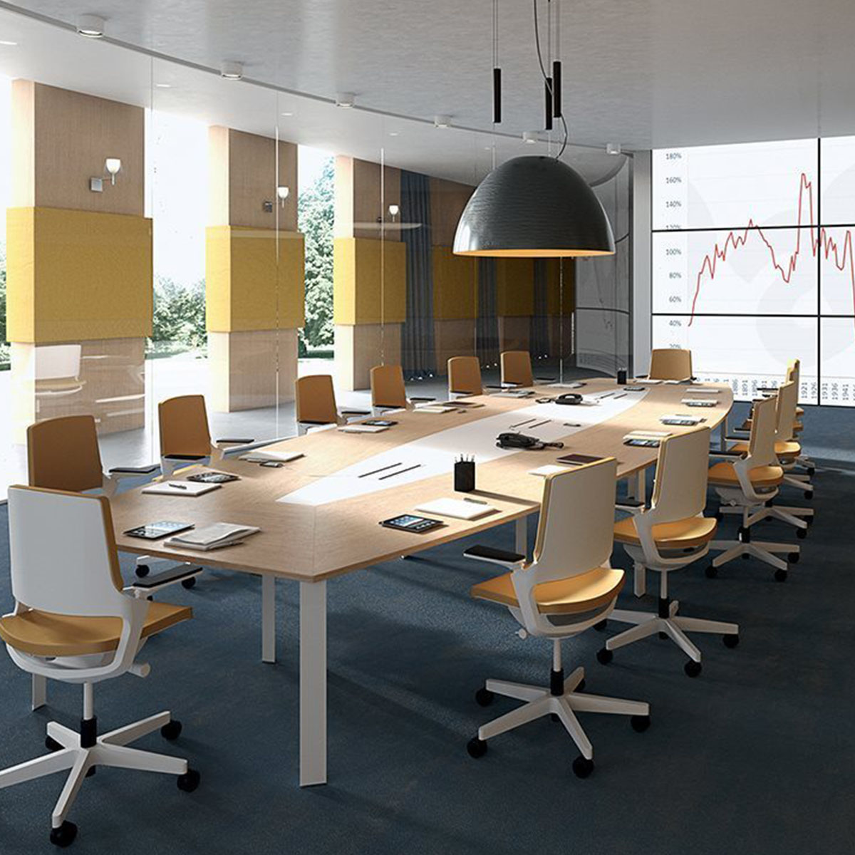Operatív tárgyalóterek elemekből összerakható, kombinálható tárgyalóasztala fém lábbal és többféle melaminált lap változattal.