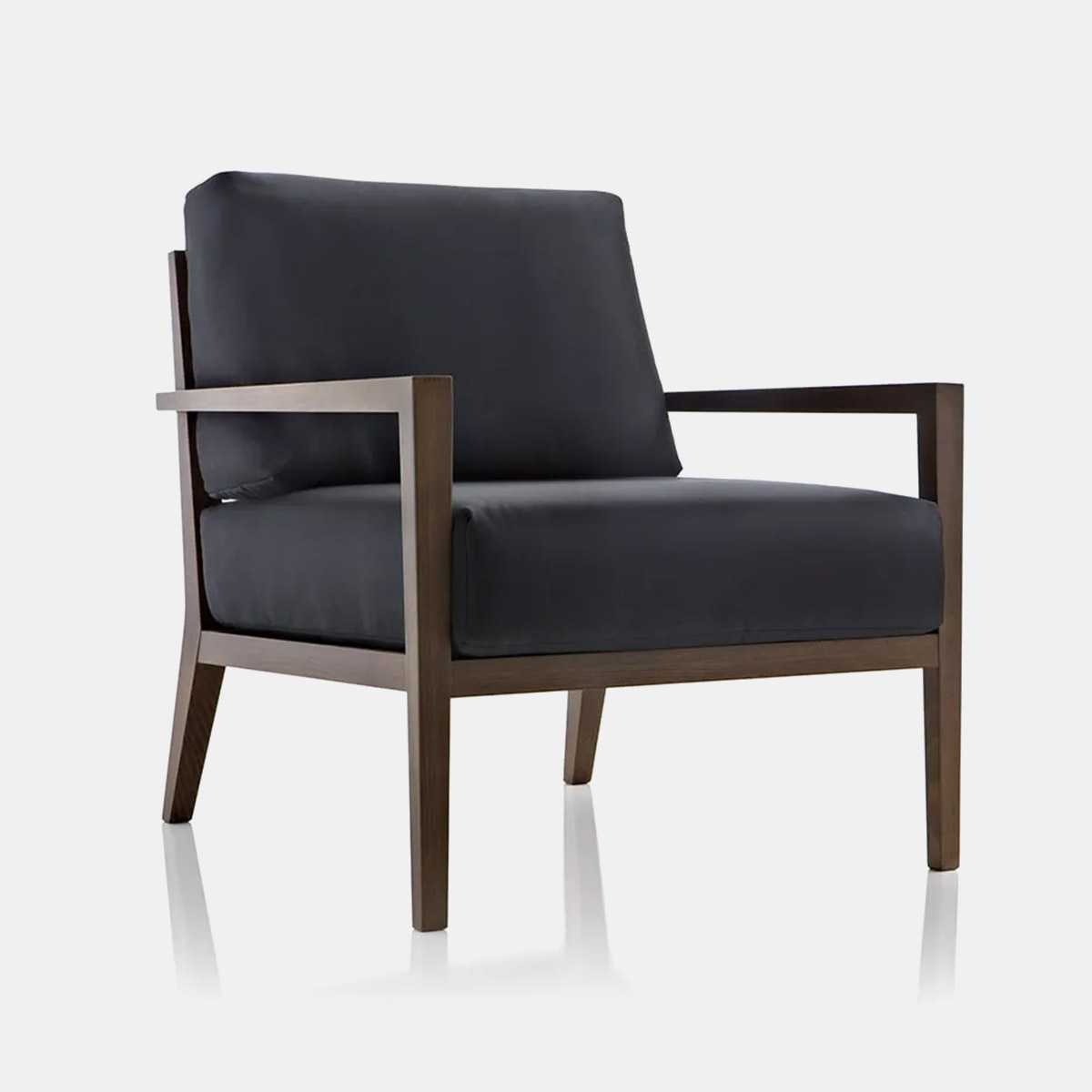 Fotel többféle pácszínben kapható bükkfa vázzal, széles kárpit vagy bőrválasztékkal.