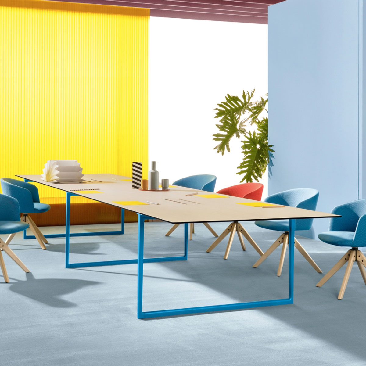 Tárgyalóasztal család színes fém lábbal, melaminált, Fenix vagy HPL lappal, több színben.