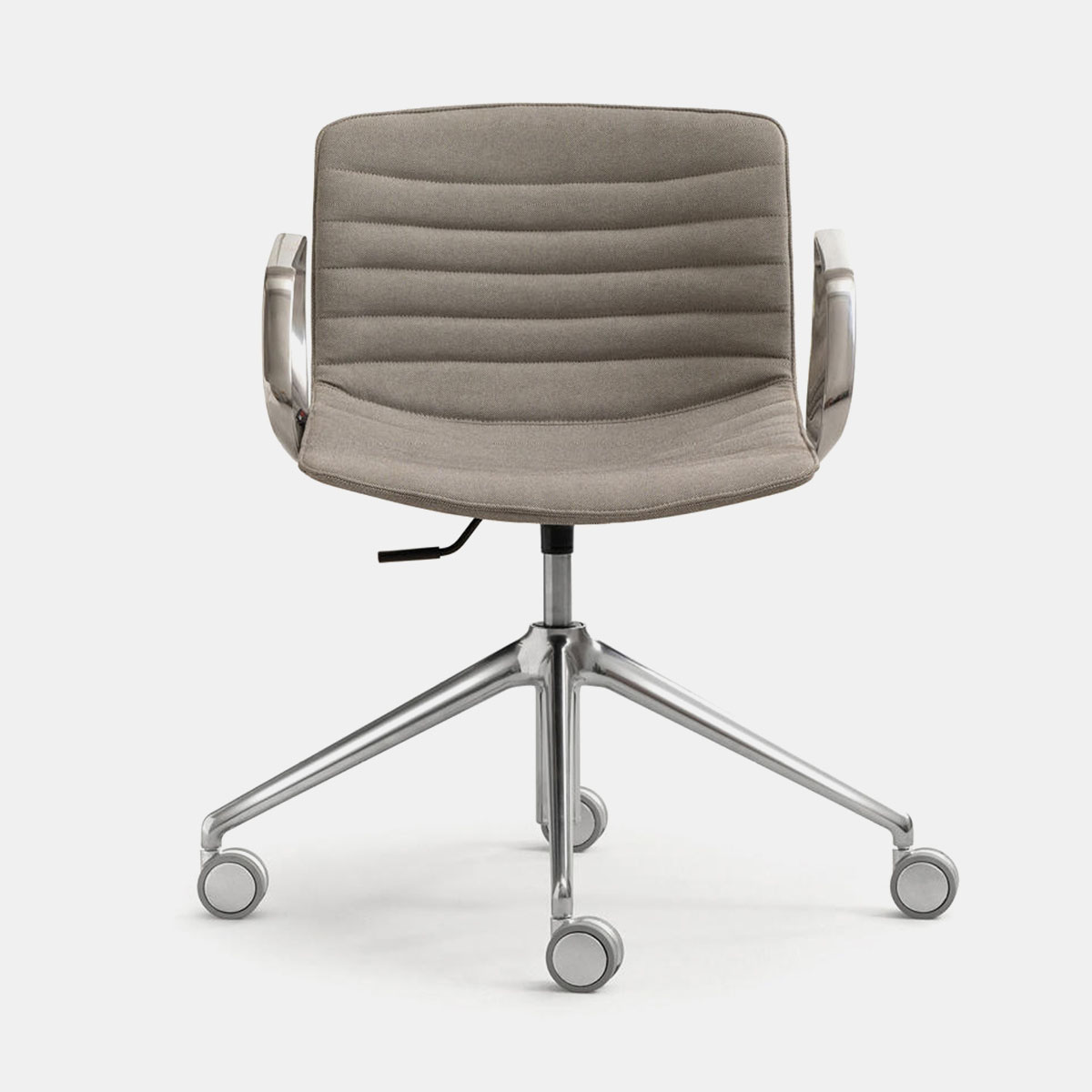 Többféle változatban és lábbal kapható tárgyalószék, görgős lábcsillaggal, steppelt kárpitozással, alumínium kartámasszal.