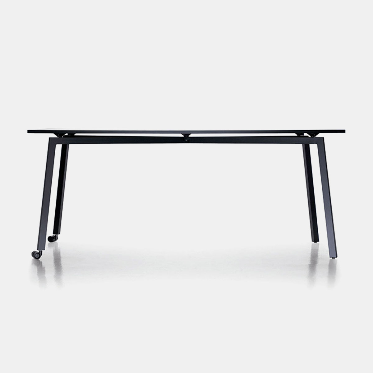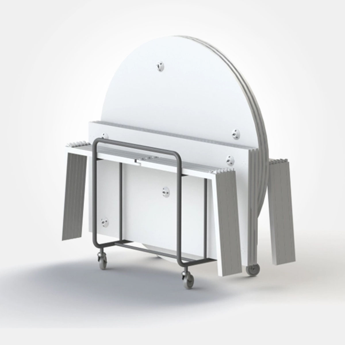 Ügyes konferenciabútor rendszer. A fémvázas asztal lába egy kattintással leszerelhető és összecsukható. Ugyanarra a lábra téglalap alakú vagy kerek lap is rákapcsolható.