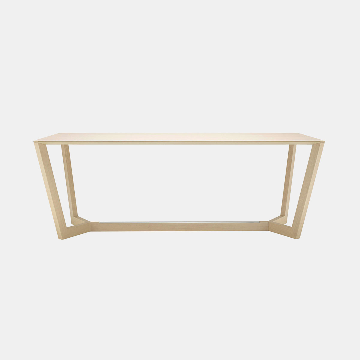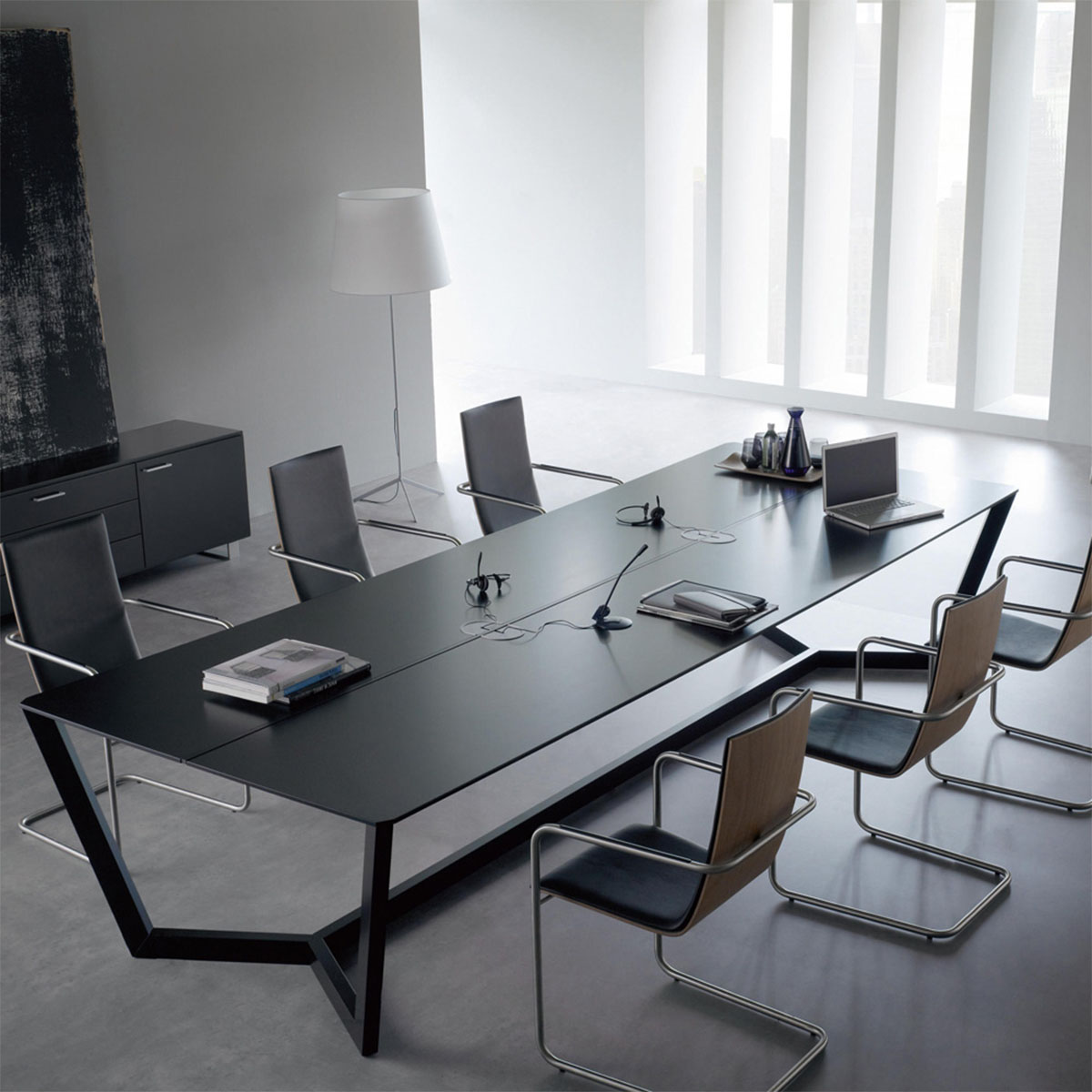 Tárgyaló-, vezetői- és könyvtári asztal család fémmel erősített tölgyfa lábbal, furnérozott lappal több pácszínnel.